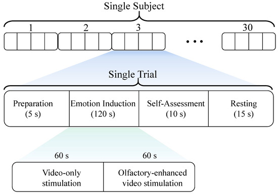 In this study’s multisensory emotion induction experiment, each session consists of 30 trials, with 10 trials assigned to each of the positive, negative, and neutral emotion categories. Each trial lasts 150 s and comprises the following four sequential phases:
