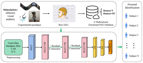 To address these challenges, this study designed a multisensory emotional induction paradigm that combines olfactory, visual, and auditory stimuli to generate more robust and distinguishable EEG signals for PI. We constructed an emotional EEG database and, for the first time, applied multisensory emotional EEG, integrating olfaction, vision, and hearing, to the field of PI. In addition, we proposed a deep learning-based model, CBR-Net, which integrates convolutional neural networks (CNN) for spatial feature extraction, bidirectional long short-term memory networks (Bi-LSTM) for temporal modeling, and residual connections along with fully connected classification modules. Through these innovations, we have made significant progress in feature extraction from EEG signals and the accuracy of PI.