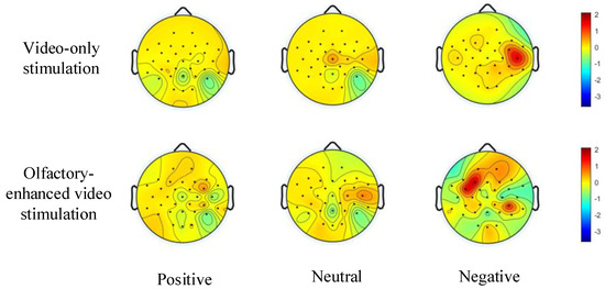 Building upon the aforementioned study, we further investigated the differences in emotion induction between video-only stimulation and olfactory-enhanced video stimulation using the multi-sensory emotional EEG dataset constructed in this study. To this end, we compared the topographic maps of power spectral density (PSD) under positive, neutral, and negative emotional states for both stimulation methods (see Figure 6). As shown in Figure 6, the overall energy of the PSD-based topographic maps increased across all emotional states after incorporating olfactory-enhanced video stimulation. Notably, the enhancement was most pronounced for negative emotions, surpassing that observed for positive and neutral emotions. Furthermore, previous studies have demonstrated that the temporal lobe plays a critical role in emotional processing [31]. From Figure 6, it can be further observed that across positive, neutral, and negative emotional states, the color intensity of the topographic maps in the temporal lobe region significantly increased following olfactory-enhanced stimulation, indicating a notable elevation in PSD power in this area. These findings further confirm that incorporating olfactory-enhanced stimulation during emotional induction can enhance neural emotional responses and facilitate deeper emotional expression.