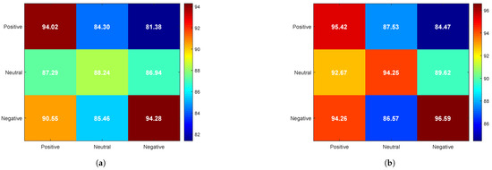 A comparison of Figure 7a,b reveals that the overall identity recognition rate improves with the addition of olfactory-enhanced stimulation, particularly in the neutral emotional state, where the recognition rate increases from 88.24% to 94.25%, reflecting a 6.01% improvement. Furthermore, the highest recognition rate is observed under the negative emotional state, with an accuracy of 94.28 under video-only stimulation, which further increases to 96.59 with olfactory-enhanced video stimulation, maintaining the highest level among the three emotional states.