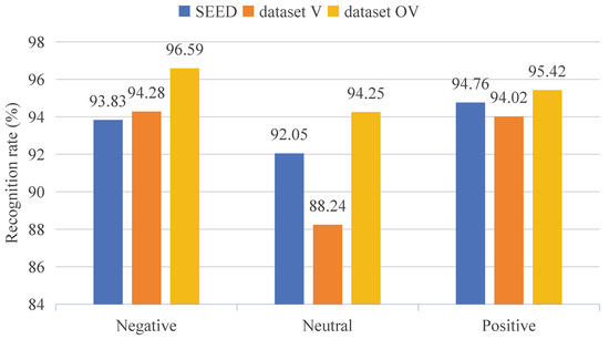 Based on the data presented in Figure 8, we compared the PI results for three emotional states (positive, neutral, negative) across different datasets. On the SEED dataset, the model demonstrated stable performance in PI for all three emotional states, with the recognition rate for positive emotions (94.76%) slightly higher than that for negative (93.83%) and neutral (92.05%) emotions. On dataset V, the model’s identity recognition results for negative (94.28%) and positive (94.02%) emotions were similar to those on the SEED dataset. However, the recognition rate for neutral emotions was lower (88.24%). On dataset OV, the identity recognition rates for all three emotional states outperformed those on the other two datasets, particularly for neutral emotions (94.25%), showing a significant improvement compared to SEED and dataset V. This indicates that olfactory-enhanced video stimulation effectively enhance the differentiation of emotions, further demonstrating the positive impact of olfactory-enhanced stimulation on emotional expression.