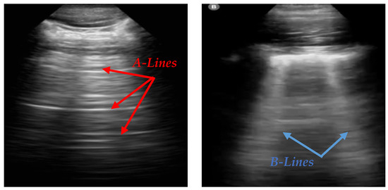 Lung POCUS shows different ultrasound patterns in COVID-19 compared to pulmonary edema, bacterial pneumonia, and other viral pneumonias, and is thus useful in differentiating between these conditions [2]. In LUS, A-lines and B-lines serve as crucial markers in the evaluation of lung health. A-lines are horizontal, reverberation artifacts seen in healthy, aerated lung tissue. These lines are typically observed when there is no abnormal fluid accumulation in the lungs, indicating normal lung conditions. B-lines are vertical, hyperechoic artifacts that extend from the pleural line to the bottom of the ultrasound image, often seen in pathological conditions. The presence of B-lines can indicate interstitial lung disease, pulmonary edema, or lung infections such as COVID-19 [3]. Various tools, like ExoLungAI, have been developed to detect these artifacts in ultrasound videos, categorizing them based on the quantity of A-lines and B-lines. Videos with more than five B-lines are classified as B-line cases, while those with dominant A-lines fall into a separate category [4]. Figure 1 illustrates the appearance of A-lines and B-lines in the lung ultrasound images used in this study.