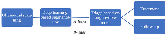 In this study, we propose an automated pipeline for lung ultrasound image segmentation to identify clinically relevant features, such as A-lines and B-lines, aimed at assisting in the management of COVID-19 patients. Ultrasound scanning plays a pivotal role in bedside evaluation, especially in emergency triage settings, offering a rapid, non-invasive assessment of lung involvement. Using deep learning-based segmentation techniques, clinically relevant features, such as A-lines and B-lines, are identified, providing critical insights into lung pathology. This automated analysis enables efficient triage by evaluating the extent of lung involvement, guiding immediate treatment decisions, and facilitating long-term monitoring of patients, especially in the case of Long COVID. Figure 2 illustrates the steps involved in the pipeline. It shows how segmentation results can be integrated into clinical workflows to support personalized treatment plans and follow-up strategies, ultimately enhancing patient care and resource management in healthcare settings.