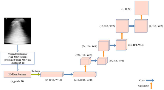 The process begins with ViT-MSN-Small, a vision transformer pretrained using Masked Siamese Networks (MSN) on ImageNet-1k, serving as a powerful backbone for feature extraction. The output of the ViT consists of hidden features, initially represented in a flat, patch-based form. These hidden features are reshaped into a spatial tensor, representing a coarse resolution of the original image. The decoder utilizes this low-dimensional tensor to reconstruct the segmentation mask. It is composed of multiple upsampling layers followed by convolutional layers, progressively refining the segmentation output. The architecture is illustrated in Figure 3.