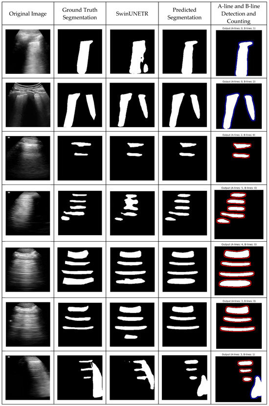 Following the segmentation performance analysis, the qualification results and post-processing steps for identifying and counting A-lines and B-lines were evaluated. After obtaining the segmentation masks, a post-processing pipeline was applied to detect lines indicative of A-lines and B-lines. The results demonstrate the proposed method’s high precision in distinguishing between these artifacts (Figure 4). Additionally, SwinUNETR achieved the second-best segmentation performance, and its results are also presented in Figure 4 for comparison. While the performance of other approaches was relatively close, SwinUNETR outperformed Attention U-Net by a small margin.