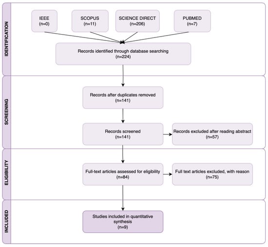 Through carefully searching the databases and additional sources, a total of 224 search results were identified. After removing all duplicates, 141 studies underwent title and abstract screening, and the inclusion criteria were examined. The full texts of 84 papers assessed for eligibility were carefully analyzed. A total of 69 articles [12,13,14,15,16,17,18,19,20,21,22,23,24,25,26,27,28,29,30,31,32,33,34,35,36,37,38,39,40,41,42,43,44,45,46,47,48,49,50,51,52,53,54,55,56,57,58,59,60,61,62,63,64,65,66,67,68,69,70,71,72,73,74,75,76,77,78,79] were excluded due to exclusion criterion (1), 1 contribution [80] due to the exclusion criterion (2) and 5 scientific results [81,82,83,84,85] due to exclusion criterion (3). Finally, only 9 studies were included in the quantitative synthesis. Figure 1 illustrates the methodological approach used. To support analysis and comparisons, all existing integrated neuroimaging and XR technology solutions and the associated system parameters are comprehensively summarized and discussed in Section 4.
