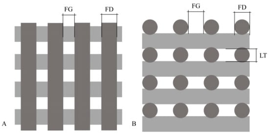 Key parameters defining this structure include a filament diameter (FD) of 0.4 mm, layer thickness (LT) of 0.3 mm, filament gap (FG) of 0.6 mm, and a total of 20 layers (LN). These dimensions were consistently maintained across all prints to ensure manufacturing uniformity.