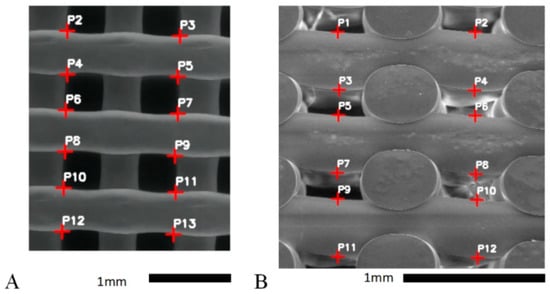 Scanning Electron Microscopy (SEM) was performed using a TM3030Plus tabletop microscope (Hitachi, Tokyo, Japan) to examine the morphology and surface characteristics of the 3D-printed scaffolds. The analysis was conducted at 5 kV without any coating, allowing for a clear visualization of the scaffold structure. For quantitative analysis, a custom Python 3.8 script was used to precisely measure the fiber diameter and pore size across various sections of the scaffold. The script calculates the filament width in vertical direction from P2 to the line formed by points P4 and P5 (Figure 3A), and similar measurements are taken for P6 to line P8–P9 and P10 to line P12–P13, with the average of these distances used to determine the filament width. The same approach is applied to measure the layer height in the side view, where the script calculates the vertical distance from point P1 to the line formed by points P3 and P4 (Figure 3B) and repeated for P5 to line P7–P8 and P9 to line P11–P12; this method enabled robust statistical analysis, with at least 20 measurements taken for each scaffold. For each set of measurements, both mean values and 5–95 percentiles were calculated to assess central tendencies and the range of variability.