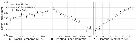 Impact of printing parameters on layer height. (A) Nozzle temperature at a constant printing speed of 800 mm/min and material feed rate of 30%. (B) Printing speed at a constant nozzle temperature of 210 °C and material feed rate of 30%. (C) Material feed rate at a constant nozzle temperature of 210 °C and printing speed of 800 mm/min.