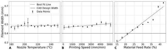 Impact of printing parameters on filament width. (A) Nozzle temperature at a constant printing speed of 800 mm/min and material feed rate of 30%. (B) Printing speed at a constant nozzle temperature of 210 °C and material feed rate of 30%. (C) Material feed rate at a constant nozzle temperature of 210 °C and printing speed of 800 mm/min.
