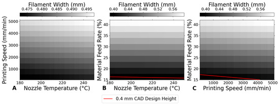 Impact of printing parameters on filament width. (A) Nozzle temperature and printing speed at constant material feed rate of 30%. (B) Nozzle temperature and material feed rate at constant printing speed of 800 mm/min. (C) Printing speed and material feed rate at constant nozzle temperature of 210 °C.