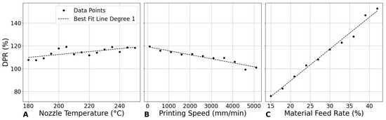 Impact of printing parameters on DPR. (A) Nozzle temperature at a constant printing speed of 800 mm/min and material feed rate of 30%. (B) Printing speed at a constant nozzle temperature of 210 °C and material feed rate of 30%. (C) Material feed rate at a constant nozzle temperature of 210 °C and printing speed of 800 mm/min.