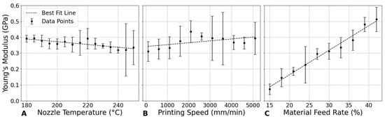 Impact of printing parameters on Young’s modulus. (A) Nozzle temperature at a constant printing speed of 800 mm/min and material feed rate of 30%. (B) Printing speed at a constant nozzle temperature of 210 °C and material feed rate of 30%. (C) Material feed rate at a constant nozzle temperature of 210 °C and printing speed of 800 mm/min.