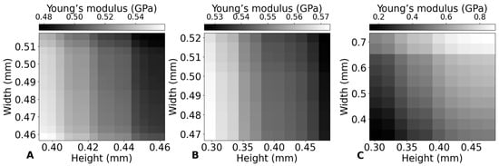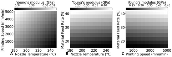 Impact of printing parameters on the Young’s modulus. (A) Nozzle temperature and printing speed at constant material feed rate of 30%. (B) Nozzle temperature and material feed rate at constant printing speed of 800 mm/min. (C) Printing speed and material feed rate at constant nozzle temperature of 210 °C.