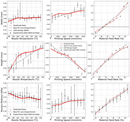 ANN model output vs. input is organized as follows: (A–C) represent predictions for filament width, (D–F) represent predictions for layer height, and (G–I) represent predictions for Young’s modulus. The plots are grouped by 3D printing parameters: (A,D,G) show the effects of nozzle temperature, with a constant printing speed of 800 mm/min and a material feed rate of 30%. (B,E,H) show the effects of printing speed, with a constant nozzle temperature of 210 °C and a material feed rate of 30%. (C,F,I) show the effects of material feed rate, with a constant nozzle temperature of 210 °C and a printing speed of 800 mm/min.