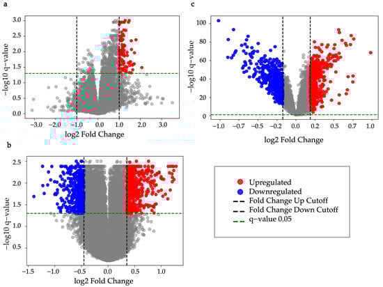 Volcano plot. (a) EGAD00001008128, q-value < 0.05, FC > 1.999 (upregulation), and FC < 1/1.999 (downregulation); (b) GSE41666, q-value < 0.05, FC > 1.277 (upregulation), and FC < 1/1.370 (downregulation); (c) GSE14520, q-value < 0.05, FC > 1.139 (upregulation), and FC < 1/1.1276 (downregulation).
