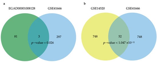 Venn diagrams. (a) IRH genes: Overlapping DEGs between EGAD00001008128 and GSE41666 datasets; (b) HHO genes: Overlapping DEGs between GSE41666 and GSE14520 datasets.