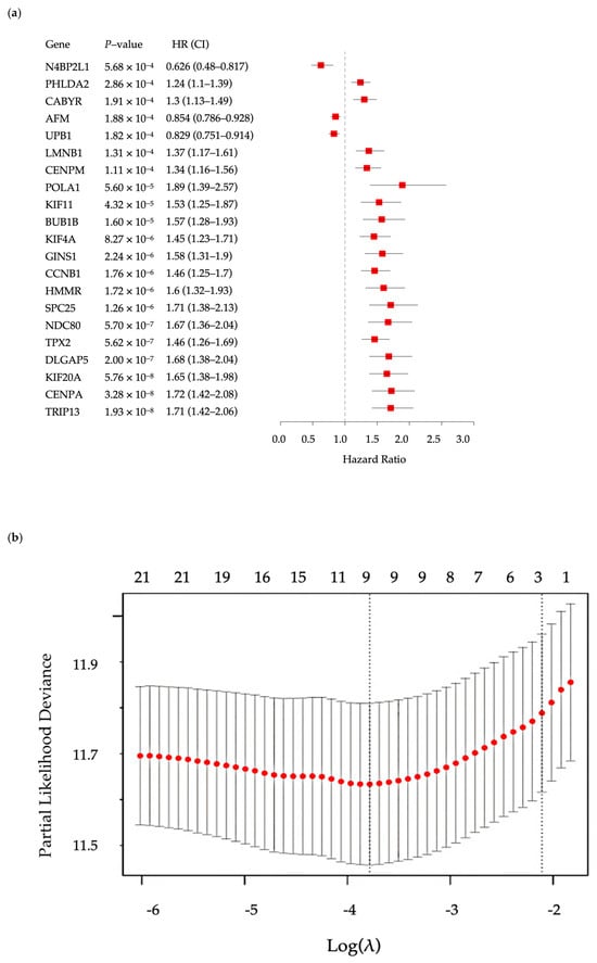 Cox regression and LASSO analysis of 21 candidate genes on HHOs, which resulted in a final model of 9 genes. (a) Cox proportional hazard regression; (b) Variable selection using Lasso algorithm and the optimal λ selection using cross-validation.