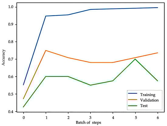 Accuracy comparison of the KAN model: the training accuracy reaches 0.9361, while the validation and test accuracies peak around 0.75 and 0.70, respectively.