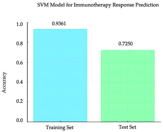 A support vector machine (SVM) model was trained using the KAN score and hypoxia scores as features to classify immunotherapy response in the EGAD00001008128 dataset. The training set included these two features, along with immunotherapy response results. The model achieved an accuracy of 0.9361 on the training set. When evaluated on the test set, the model achieved an accuracy of 0.725 (Figure 6). The SVM model used a radial basis function (RBF) kernel with parameters gamma = 0.2 and C = 0.1. These results demonstrate that the combination of KAN and hypoxia scores provides strong predictive power in immunotherapy response.
