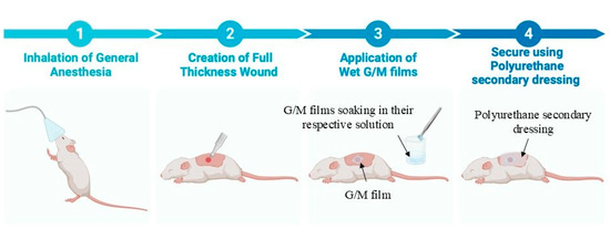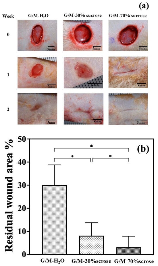 The G/M films were trimmed into squares with 16 mm sides and a thickness of 0.25 mm ± 0.02 mm under swollen conditions. The trimmed G/M films, sucrose solutions, and surgical instruments were sterilized using an autoclave (LBS-245; Tomy Seiko Co., Ltd., Tokyo, Japan) at 121 °C at 120 kPa for 20 min before surgery. The animal experiment was designed according to the guidelines approved by the Animal Care and Use Committee of Yamagata University (Figure 1). A total of eighteen male Sprague-Dawley rats weighing 250–300 g were used in this study to evaluate three groups of wound dressings. These included (i) G/M-H2O (control), (ii) G/M-30% sucrose, and (iii) G/M-70% sucrose. An inhalation anesthetic was first administered to sedate the rats, followed by an intramuscular injection of a triple anesthetic mixture. The amount of the triple anesthetic mixture was administered according to the rat’s body weight (kg): Medetomidine hydrochloride (NIPPON ZENYAKU KOGYO Co., Ltd., Fukushima, Japan), 0.15 mg/kg; Midazolam (Astellas Pharma Inc., Tokyo, Japan), 2.0 mg/kg; and Butorphanol tartrate (Meiji Seika Pharma Co., Tokyo, Japan), 2.5 mg/kg. Dorsal and ventral hair was then completely removed using a hair clipper and hair removal cream. The surgical site was then disinfected with 7% povidone-iodine and 70% ethanol to prevent contamination. Full-thickness skin incisions were then made on the abdomen using a 10 mm diameter trephine bar. Simultaneously, autoclaved G/M films were immersed in their respective solutions for 30 min prior to application to the wound site. The wounds were then covered with the hydrated G/M film of the respective treatment group and secured with a polyurethane secondary dressing. The wound healing status of all groups was evaluated at 1 and 2 weeks after treatment.