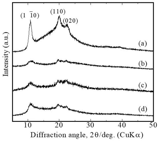 XRD patterns of G/M in (a) dry state, (b) hydrated state in distilled water, (c) 30% sucrose solution, and (d) 70% sucrose solution.