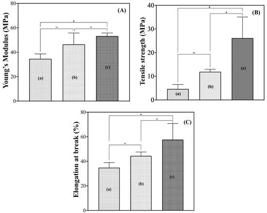 (A) Young’s modulus, (B) tensile strength, and (C) elongation of G/M hydrated in (a) distilled water, (b) 30% sucrose, and (c) 70% sucrose. *: p < 0.05, ns: not significant.