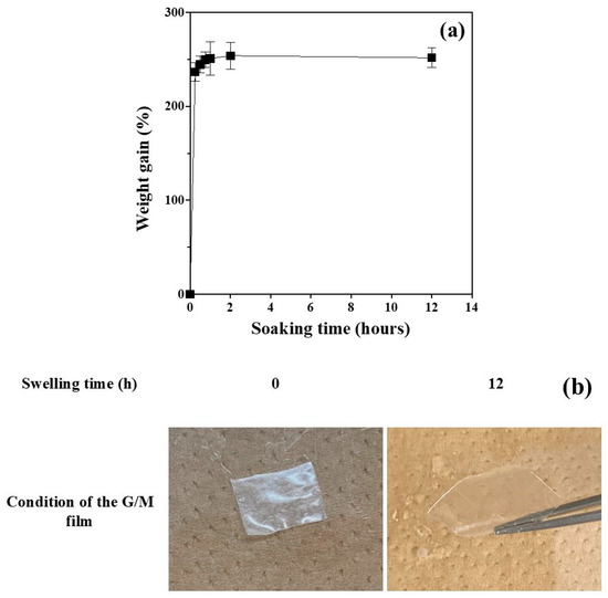 The ability to absorb excess fluid is one of the most important properties of a wound dressing. The absorption test was performed for 12 h at 37 °C to determine the absorption properties of G/M (Figure 5a). G/M achieved a maximum swelling ratio of 250 ± 10.32% after swelling in PBS for 2 h. During fluid absorption, the water molecules infiltrated into the G/M structure and interacted with the hydrophilic groups of the G/M structure. In addition, the ability of the G/M film to absorb water was said to be influenced by the availability of vacant hydroxyl groups in the G/M backbone [24]. Therefore, it was observed that the percentage of weight gain increased drastically at the beginning and leveled off when the G/M reached its equilibrium, with no more vacant hydroxyl groups available. Moreover, there was no weight loss and no change in state of the G/M film after soaking in PBS for 12 h. This indicates that G/M has is sufficiently able to absorb liquid while maintaining its original state (Figure 5b).