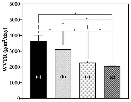 Water vapor transmission rate of (a) control, (b) G/M-H2O, (c) G/M-30% sucrose, and (d) G/M-70% sucrose at 37 °C for 14 days. All groups except control group consist of polyurethane secondary dressing. *: p < 0.05, ns: not significant.