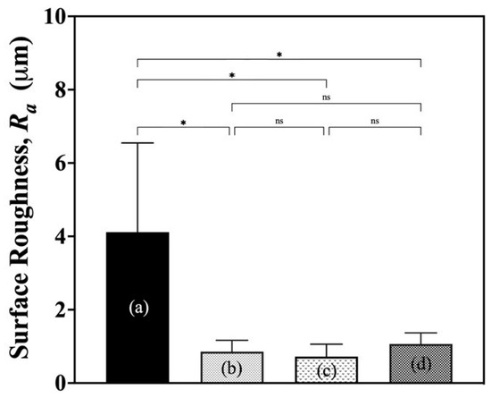 Surface roughness of G/M in (a) dry state and after soaking in (b) distilled water, (c) 30% sucrose, and (d) 70% sucrose. *: p < 0.05, ns: not significant.