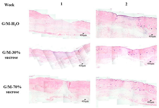 The wound healing statuses of the following dressing groups: G/M-H2O, G/M-30% sucrose, and G/M-70% sucrose were monitored at 1 and 2 weeks after surgery. Based on visual assessment (Figure 8a), the wound closure effect at 1 week was greatest in the G/M-70% sucrose group compared to all other groups. The residual wound areas of the G/M-H2O, G/M-30% sucrose, and G/M-70% sucrose groups were 29.98 ± 8.80%, 8.1 ± 5.68%, and 3.13 ± 4.75%, respectively. The percentage of residual wound area in Figure 8b showed that the presence of sucrose coupled with G/M film had significantly promoted wound closure at an early stage. At 1 week, granulation tissue was observed in G/M-H2O, indicating that epidermal regeneration had not occurred. In the G/M-30% sucrose group, pinkish tissue was found at the wound site. On the other hand, the G/M-70% sucrose treatment group achieved almost complete wound closure after 1 week of healing. After 2 weeks of healing, all treatment groups had achieved complete wound closure. However, the regenerated tissue condition was better in the G/M with sucrose treatment groups than in the G/M-H2O group. Because macroscopic evaluation only provided the superficial healing status of the wound, various tissue stains were performed to examine the healing progress of each wound in more detail.