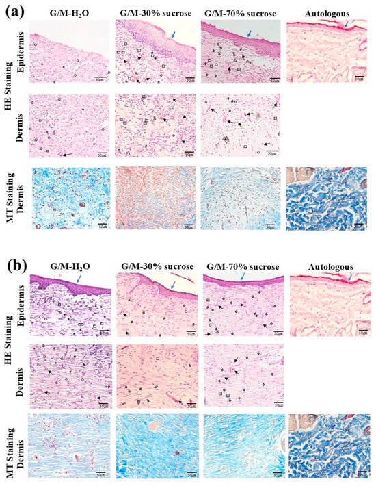 At 2 weeks of wound healing (Figure 10b), the epidermal layer was found in all three treatment groups. In addition, the epidermal layer thickness of the G/M-30% sucrose and G/M-70% sucrose groups further decreased, with the epithelial layer of the G/M-70% sucrose group more closely resembling the thickness of autologous skin epidermis. In the G/M-H2O control group, the number of neutrophils decreased along with the presence of macrophages and some fibroblasts. In contrast, the number of macrophages decreased in both sucrose treatment groups and was dominated by fibroblasts. MT staining showed that the orientation of the collagen fibers was improved in all groups. Coarse and dense collagen fibers were identified in the sucrose treatment groups. However, the collagen fibers of the control group were fine and sparse compared with those of the sucrose-treated groups. This was consistent with HE staining, which showed a smaller number of fibroblasts.