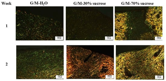 PSR staining (Figure 11) was used to differentiate between type III and type I collagen present at the wound site [29,30]. Type III collagen appears green to yellowish-green and type I collagen appears yellowish-orange to orange in PSR staining under polarized light microscopy [31]. At 1 week, green and yellowish-green collagen fibers were observed in all three treatment groups. This indicated that type III collagen dominated the wound site in all treatment groups, which was consistent with the MT staining results. At 2 weeks, denser yellowish-green collagen fibers were found in the G/M-H2O control group. In contrast, yellowish-orange type I collagen fibers were formed in both sucrose treatment groups. However, coarser and more oriented collagen fibers were observed in the G/M-70% sucrose group.