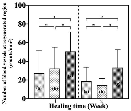 Number of blood vessels in the regenerated tissue region at 1 and 2 weeks post-operation: (a) G/M-H2O, (b) G/M-30% sucrose, and (c) G/M-70% sucrose. *: p < 0.05, ns: not significant.