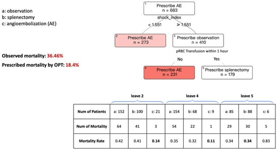 The table below the figure displays the observed mortality rates for patients in the terminal leaves across different treatment groups based on the original dataset. The bolded mortality rate represents the treatment associated with the lowest observed mortality, which corresponds to the recommendations of the OPT model. For example, in leaf 2, following the OPT branching process, there were 273 patients in total. Of these, 21 patients received angioembolization, with an observed mortality rate of 0.14—the lowest among the three treatment modalities, consistent with the OPT recommendation.