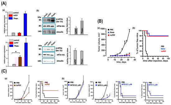 (A) Activation of ER Stress Sensors IRE1 and PERK. EL-4 and CT26 cells were treated with iso-effective doses of nsPEFs (100 and 300 pulses, respectively; 200 ns, 7 kV/cm, 10 Hz). Samples were collected 5 h post treatment. IRE1 Activation (a): XBP1 expression in EL-4 and CT26 cells was quantified using real-time PCR, normalized to HPRT mRNA, and expressed as relative expression levels. PERK Activation (b): Phosphorylation of eIF2α was assessed by Western blot with anti-phospho-eIF2α (Serine 51) antibody. Representative blots for EL-4 and CT26 cells showed total and phosphorylated eIF2α, with Vinculin as a loading control. Quantifications were expressed as fold change relative to sham treatment. Thapsigargin (1 μM) served as a positive control. Mean ± s.e.; n = 3 for both assays. p < 0.001 for nsPEFs vs. sham. * p < 0.01. (B) Tumor Immunogenicity of nsPEFs-treated CT26 Cells CT26 tumor cells were subjected to nsPEFs (600 pulses, 200 ns, 7 kV/cm, 10 Hz) and immediately injected into the flank of syngeneic BalbC mice (0.6 × 106 cells/mouse). Control groups received either PBS or CT26 cells treated with doxorubicin (Doxo, 25 μM, 24 h). Seven days later, animals were challenged with live tumor cells (0.1 × 106 cells/mouse) in the opposite flank. Tumor Growth and Protection: Panel (a) shows tumor growth curves, while (b) presents the percentage of tumor-free animals. Data represent animals without tumor development at the vaccination site. Mean ± s.e.; n = 10, 10, and 9 for PBS, Doxo, and nsPEFs groups, respectively. (C) Comparative Immunogenicity of nsPEFs and Mitoxantrone-treated EL-4 Cells EL-4 tumor cells were treated with nsPEFs (200 pulses, 200 ns, 7 kV/cm, 10 Hz) or mitoxantrone (MTX, 0.5 μM or 1 μM, 24 h) and injected into syngeneic C57BL6 mice (0.6 × 106 cells/mouse). Control groups received PBS. Seven days post vaccination, animals were challenged with live EL-4 cells (0.03 × 106 cells/mouse) in the opposite flank. Tumor Growth and Protection: Top graphs show tumor growth curves, and bottom graphs display the percentage of tumor-free animals. Data represent animals without tumor development at the vaccination site. Mean ± s.e.; n = 9 (PBS) and 6 (nsPEFs) in (a) and n = 9, 9, 8, and 8 for PBS, 0.5 μM MTX, PBS, and 1 μM MTX groups in (b), respectively. p < 0.01 [29].