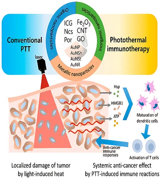 Diagrammatic representation of photothermal treatment (PTT) nanoparticles based on therapeutic principles. The targeted cancer’s cell death (apoptosis or necrosis) in the radiated area is prioritized in conventional PTT. Photothermal immunotherapy, on the other hand, targets the immune responses following PTT in order to provide a systemic anti-cancer impact. (The following are abbreviations: GO (graphene oxide); AuNP (gold nanoparticles); AuNSh (gold nanoshells); AuNSt (gold nanostars); AuNR (gold nanorods); Hsp (heat shock protein); HMGB1 (high-mobility group box 1); ATP (adenosine triphosphate); PTT (photothermal therapy); ICG (indocyanine green); Ncs (naphthalocyanines); Por (porphyrin); CNT (carbon nanotubes) [60].