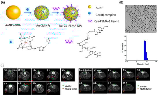 Au-Gd3+-PSMA NPs for MR-guided radiation therapy. (A) A schematic of Au-Gd3+-. PSMA NPs. (B) TEM micrograph demonstrates that Au-Gd3+-PSMA NPs have an average core size of 5 nm, while DLS shows a hydrodynamic diameter of 7.8 nm. (C) In vivo tumor targeting of Au-Gd3+-PSMA NPs and MR imaging of PC3pip and PC3flu mice at 7 T. PC3pip tumor cells display high PSMA levels, while PC3flu tumor cells express low PSMA levels [80].