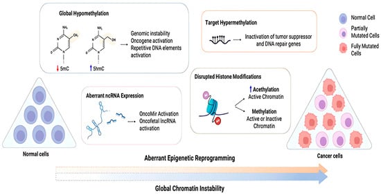 Diagram depicting cancer cells’ abnormal epigenetic reprogramming. Cancer cells exhibit global chromatin instability due to aberrant reprograming of normal cells, which includes loss of global methylation, altered ncRNA expression, disrupted histone modifications, and hypermethylation of target genes. This abnormal reprograming can inactivate tumor suppressor and DNA repair genes while activating oncogenes. 5-methylcytosine (5mC) and 5-hydroxymethylcytosine (5hmC) are defined [110].