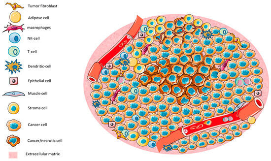The tumor microenvironment (TME) consists of various cell types, including tumor cells, immune cells, epithelial cells, and stromal cells. Regions characterized by low nutrient and oxygen levels lead to necrosis [154].