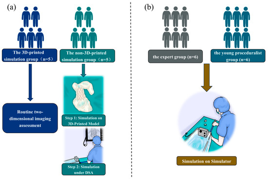 Schematic of the flow of this study. (a) The five proceduralists in the group utilizing 3D-printed simulations sequentially performed two simulation steps prior to the TPVR. In contrast, the five proceduralists in the non-3D-printed simulation group carried out a standard two-dimensional imaging evaluation before the TPVR procedure. (b) Both the expert group (n = 6) and the young proceduralist group (n = 6) successfully conducted three rounds of simulations using the pulsatile simulator.
