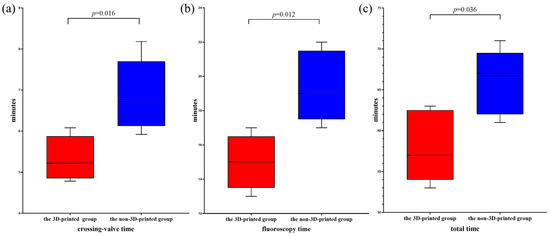 Outcomes of TPVR. (a) A comparative analysis of the crossing-valve duration was conducted between the group utilizing 3D-printed simulations and the group employing non-3D-printed simulations, revealing a statistically significant difference (p = 0.016). (b) An additional comparison of the crossing-valve duration between the 3D-printed simulation cohort and the non-3D-printed simulation cohort indicated a significant difference in fluoroscopy time as well (p = 0.012). (c) Furthermore, a comparison of the overall procedural time between the 3D-printed simulation group and the non-3D-printed simulation group demonstrated a highly significant difference (p = 0.036). The p-value is from a non-parametric test.