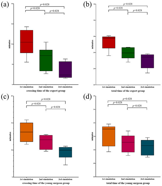 Table 4 presents the baseline characteristics of the proceduralists involved in this study. Within the expert cohort, the average age was recorded at 42.00 years (range: 40.50–45.50 years), accompanied by an average professional experience of 12.50 years (range: 11.75–17.50 years), with 10.00 years (range: 8.50–11.25 years) specifically for interventional procedures. Conversely, in the young proceduralist cohort the mean age was noted to be 30.50 years (range: 29.75–31.50 years), with an average of 3.00 years (range: 2.00–4.00 years) of mean working experience and 1.50 years (range: 1.00–2.00 years) of experience in interventions, respectively. Six of the experts and six of the young procedural experts finished the three simulations successfully. The duration required for completing the simulations is detailed in Table 5. In the expert group, the crossing-valve time required for the first simulation was 10.19 min (range: 9.12–11.39 min), which decreased to 8.87 min (range: 7.34–9.44 min) and 6.95 min (range: 6.69–8.28 min) in the next two simulations. The total time for the three simulations showed a decreasing trend to 27.79 min (range: 26.53–27.96 min), 25.95 min (range: 25.31–26.64 min), and 25.44 min (range: 24.08–25.75 min), respectively. (Figure 4a,b). For the young proceduralist group, there was also a gradual trend of decreasing crossing-valve time and total time in the three simulations, with crossing-valve times of 13.33 min (range: 11.53–15.05 min), 11.91 min (range: 10.08–12.76 min), and 9.99 min (range: 8.65–10.54 min), and total times of 33.09 min (range: 30.55–33.45 min), 31.13 min (range: 29.66–32.10 min), and 30.64 min (range: 29.19–31.45 min), respectively (Figure 4c,d). From the above results, we observed a significant decrease in both crossing-valve and total time as the number of simulation training sessions increased. The reduction in time was independent of the experience level of the trainees.