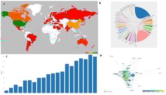 Attributes such as keywords, authors, institutions, and countries were examined. The term maps for software analysis were generated with the following settings: “create a map based on bibliographic data”, “read data from bibliographic database files”, “type of analysis: co-occurrence”, “unit of analysis: all keywords”, and “counting method: full counting”. The statistical analysis results were visualized as a network of circles, each representing an item. The size of each circle corresponded to the item’s frequency in various publications, while the color indicated its cluster. The distances between circles reflected the frequency of their co-occurrences. Country-specific data on related research were visualized using Excel 2019 (Microsoft, Redmond, WA, USA).