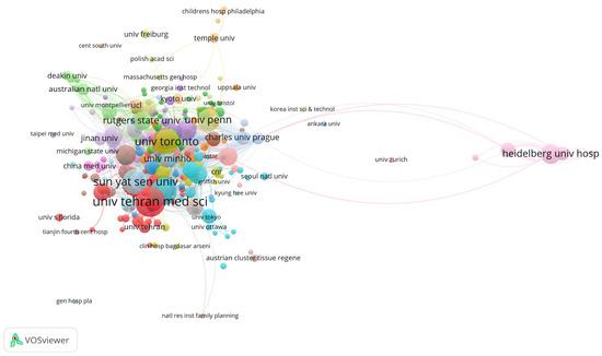Main institutions contributing to research on tissue engineering-based treatment strategies for spinal cord injury. Each node represents an institution, with its size corresponding to the number of citations received. The node’s color denotes distinct research topics (red is biomaterials; blue is stem cells; and green is clinical translation), while the connecting lines between nodes signify co-citation relationships.