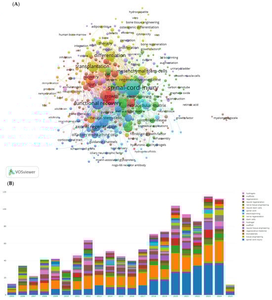 The most popular key words in studies on tissue engineering-based treatment strategies for spinal cord injury. (A) Visualization of the keyword co-occurrence network. Each node represents a keyword, with its size reflecting its frequency of occurrence. The node’s color corresponds to different research topics (red represents regeneration-focused terms such as axonal regeneration, functional recovery; blue represents stem cell and transplantation themes; and green represents biomaterial innovations such as hydrogels and the extracellular matrix), while the connecting lines between nodes indicate co-occurrence relationships. (B) The bars shows how the focus of research has shifted over time: In the early 2000s, there was a dominance of in vitro studies and differentiation. Post-2010, there has been a rise in research on hydrogels and genetic engineering.