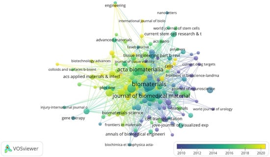 Citation overlay visualization for institutions. Each institution is depicted as a node, with the node size reflecting its citation count (Biomaterials: 4112 citations). The connecting lines between nodes are color-coded based on a gradient scale corresponding to the years (blue—pre-2010 period; yellow—post-2020 period).