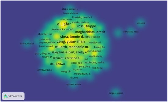Density visualization of the most productive authors in research on tissue engineering-based treatment strategies for spinal cord injury shows that the leading authors like Stephanie M. Willerth (865 citations) anchor collaborative networks, while emerging researchers (e.g., Fabian Westhauser) show rising productivity. Color intensity indicates the author’s influence (bright yellow—most cited; blue—niche contributors). Overlay: collaborative clusters (e.g., Yuan-shan Zeng’s team forms a dense hub in China).