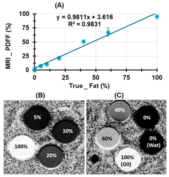 3.3. Validation of PDFF Measurements Using Water–Fat Phantom Models