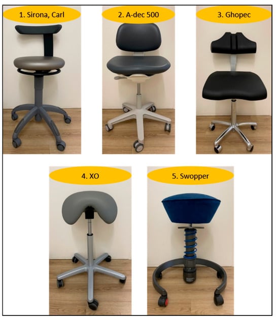- De Bruyne, M.A.A.; Danneels, L.; Braet, V.; Van De Sijpe, E.; Vanwijnsberghe, M.; Verhenne, L.; Willems, T. Do stool types have an influence on cervicothoracic muscle activity and cervicothoracic posture among dentists/dental students? Appl. Ergon. 2021, 97, 103519. [Google Scholar] [CrossRef]